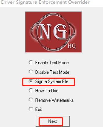 然后打开下载的driver-signature-enforcement-overrider软件,打开后点nest,yes,然后选择sign a System File
