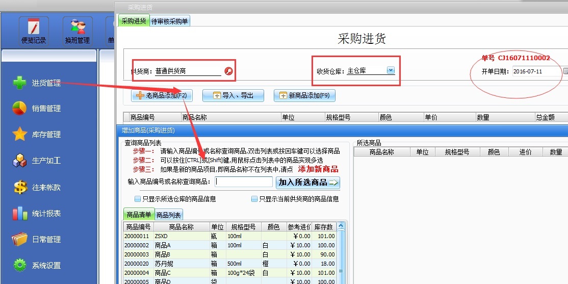 需要您选择好对应的供货商、收货仓库、以及开单的日期,然后点击老商品添加,在左侧栏商品清单选择您需要采购的商品双击。