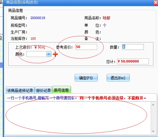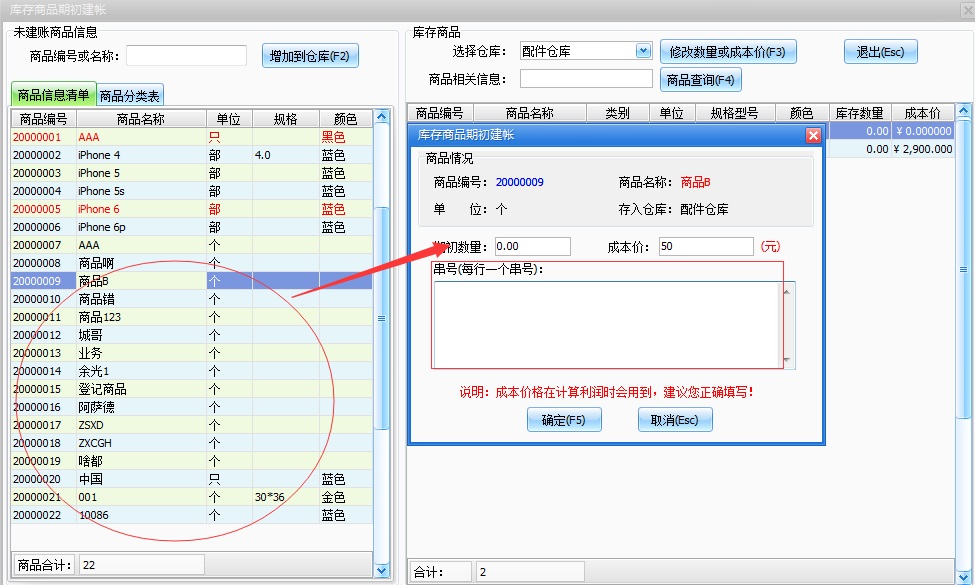 例如您现在现实库存有该商品10部,那么您在期初数量位置输入10,成本价您设置好,每部手机对应一个串号,需要您在串号栏录入每部手机的串号。那么您到时做销售时就可以选择对应的手机以及串号进行销售的。