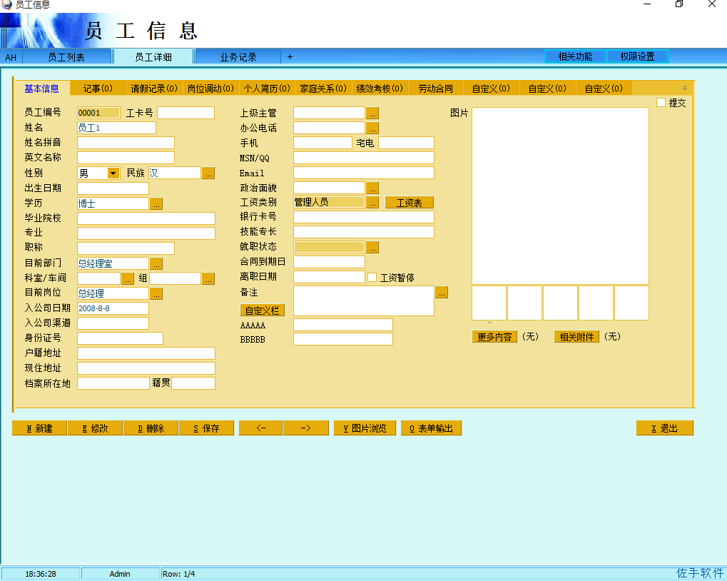 1、员工信息是人事管理模块的主程序,保存了所有在职离职员工的各种人事资料,可以通用权限设置来设定哪些用户可以查看和修改这些数据,权限设置里分基本信息和人事信息,如果没有人事信息查看权的话,则只能查看详细页面里的第一个页面。注意员工部门的输入是在岗位调动里添加一条新的调动记录,填入部门和岗位。