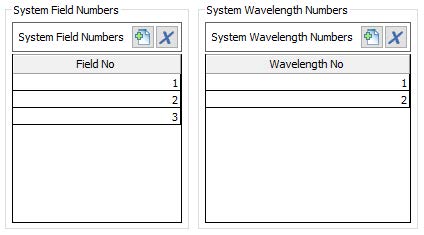 当前允许用户通过链接到光学分析模型或先前生成的线性光学模型文件来计算波前误差的功能现在支持多个场和波长。场和波长编号在SigFit中指定,如下所示。线性光学模型将使用到场和波长的每种组合的光学分析链接生成,并将用于生成每种模型的波前预测。