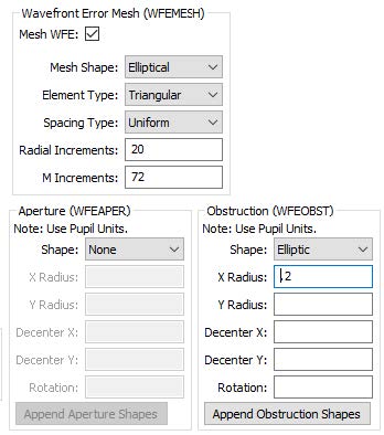通过将网格,孔径和障碍物特征与表面允许的特征相结合,增加了在光瞳空间中施加孔径和障碍物的支持。 用户指定要应用于计算波前的瞳孔的网格。 通过评估波前的多项式表示来填充此网格。 可以定义以标准化瞳孔坐标表示的光圈或障碍物。