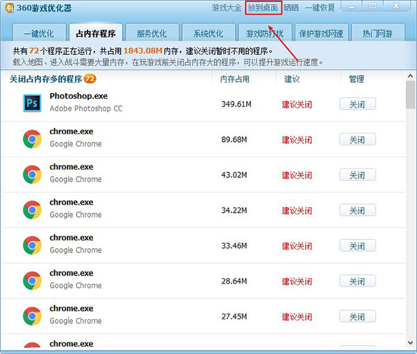 在玩游戏之前,将占内存、卡网速的程序退出,给系统减负,加快游戏运行速度。您可以一键优化,也可以根据需要逐个优化。