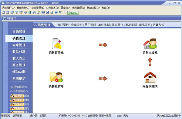 速拓进销存管理系统是一款可以对公司的订货、入库、进货、销售等等进行智能化的管理,拥有售后服务、捆绑销售、赠品管理、促销管理、定价管理、会员管理、固定资产管理、工资管理等诸多管理功能。速拓进销存管理系统以表格的形式将每一位员工销售的成绩展现在你面前,轻松得将员工之间的差距进行比对以分配给予员工的提成。用户还可以通过速拓进销存管理系统实时观察产品的销售量,把握产品销售的第一时间信息,制定最合理的销售计划。有需要的用户可以到此下载。