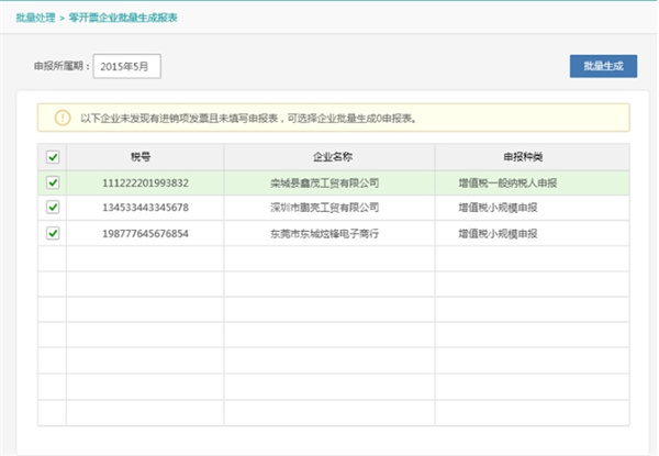 2、选中需要零申报的企业,点击“批量生成”按钮对零申报的企业进行报表自动填报。
