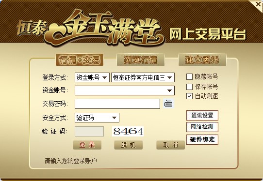 恒泰金玉满堂网上交易平台是一款由恒泰证券股份有限公司推出的综合证券交易软件,它集行情、分析、专业资讯以及委托等服务于一体,更是融合了各种资源模块,拥有:“动态口令”、“硬件绑定”、“入侵检测”、“信息回显”等面板,可以帮助用户使用软件进行理财交易提供一个很好的服务体验。同时软件还新增了“OTC产品菜单”、“沪港通”、"新华伊诺宝"等功能,在用户进行交易的时候还可以提供延时港股、外汇、期货等服务,在使用系统操作时更加顺畅、安全和稳定,拥有一个完好的交易体验。如果大家需要一个功能强大,稳定的股票交易平台,那不妨来下载这款恒泰金玉满堂电脑版,它可以让客户时刻掌握市场的行情,拥有各种专业信息,让大家的投资更有把握。