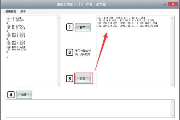 1、路由汇总助手是一款专门进行路由汇总的工具2、包含路由排序,去重、批量汇总、重叠路由检查功能