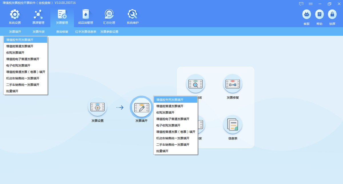 开票软件能够实现对增值税专用发票、增值税普通发票(农产品收购发票和农产品销售发票也属于增值税普通发票)、货物运输业增值税专用发票、机动车销售统一发票的开具管理功能,即能够同时开具、管理和查询不同类型的发票。企业具体可开具的发票种类取决于税务端的授权。