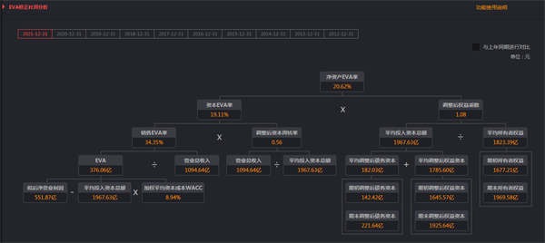 EVA修正杜邦分析将净资产EVA率分解为资本EVA率和调整后权益乘数,资本EVA率是单位资本投入创造的EVA值,比率越大表示经营获利能力越强;调整后权益乘数表示财务杠杆大小,比率越小表示财务风险越小。通过与上年同期数据进行对比,可获知企业经营能力的发展变化。