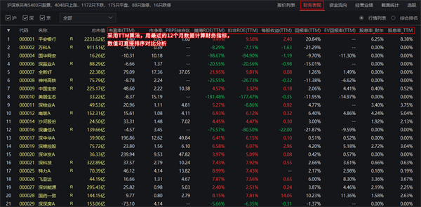 工具一:财务表现排名 都是同类企业,明明A比B的每股收益高,为什么A的股价就是涨不过B?是我看错了?还是大家都看错了?其实有时候可能是数据“出错了”! 传统软件将季报和年报、季报和半年报的数据放在一起展示,3个月的收益和6个月的收益没有可比性,已经失去了对比的意义。 wh5的财务表现对一系列关键性财务指标数据进行了深加工处理,使用TTM算法将统计时间拉齐为12个月,可直接排序选股、指导交易。