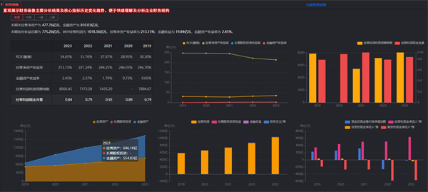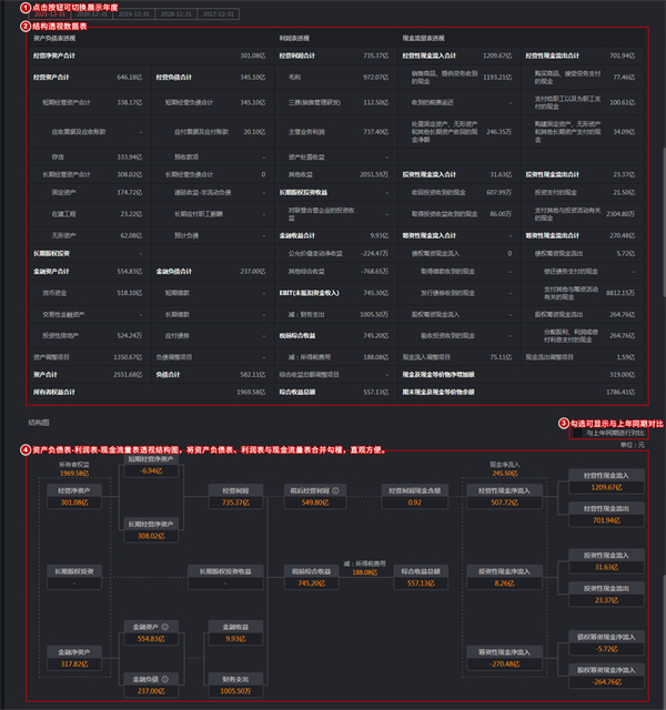 wh5基于管理用财务报表和科目的分类重组,对企业的资产、负债、收益和现金流进行了结构化处理,直观展示企业经营性资产负债与金融性资产负债的比重关系、衡量企业利润来源构成、重新搭建三表勾稽关系。