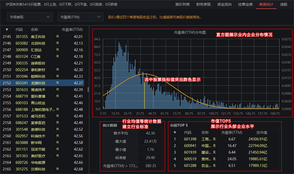 wh5的截面统计工具,统计了行业内股票的市场表现、盈利能力、现金能力、议价能力、管理能力、偿债能力和银行专项等各类指标的分布情况,通过分析行业均值数据建立行业“及格线”,并参考市值TOP5企业的相关数据,快速建立行业“优秀”企业的评判标准。