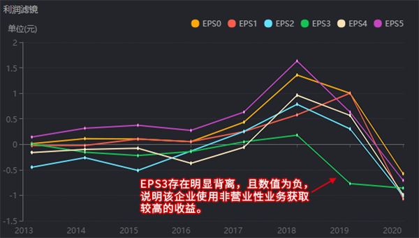 利润滤镜提供的EPS数据叠加图表,可通过分析各曲线的趋势、间距、背离等情况,直观展现企业各年份披露的净利润是否存在水分。