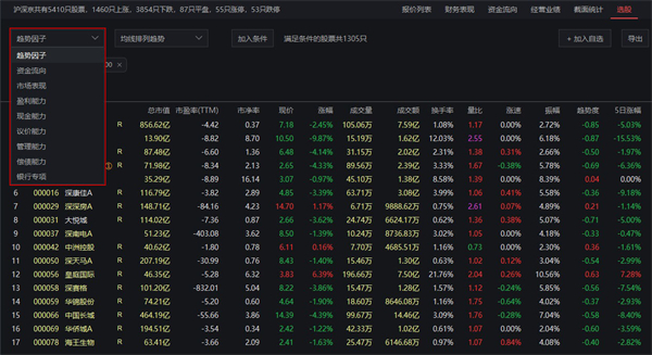 wh5财务选股有别与传统的技术面选股,可直击企业经营状况,通过对和企业经营息息相关的市场表现、盈利能力、现金能力、管理能力、银行专项等多方面指标进行排名分析,逐步排除业绩表现差或表现平庸的企业,选出各行业内竞争力强、适合长期持有的优质股票。