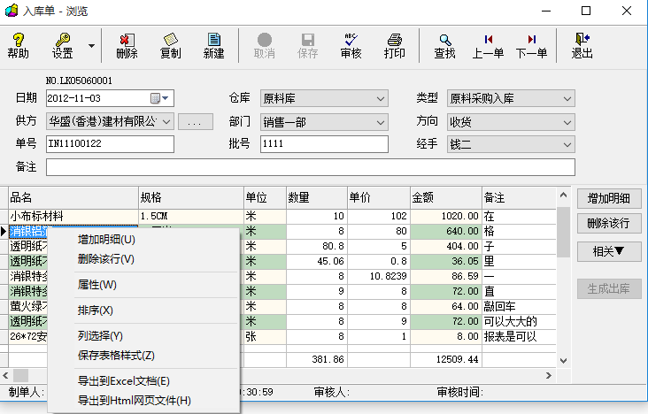 1、添加明细:将货品添加至入库单内。点击“设置”/“添加明细”,弹出货品资料界面,在界面左侧选择货品类别,右侧会出现相应的货品数据,选中要添加的货品双击,即可添加至入库单内,之后输入添加货品的数量、单价及金额,或者根据“系统设置”中的配置进行自动计算;