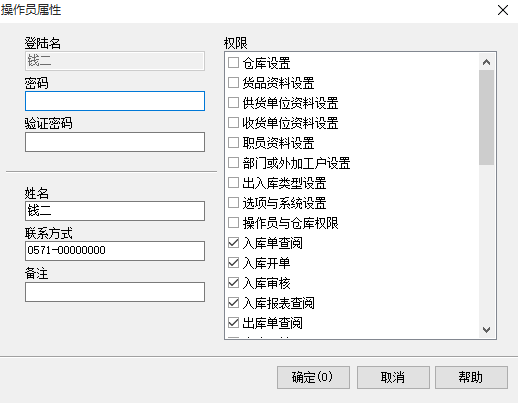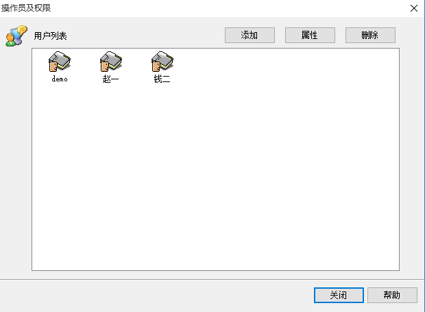 【操作员及权限设置】 1、使用此功功能来管理操作员及其权限,添加、删除使用本软件的操作员,授权他们可以使用哪些功能。此功能只有系统管理员可以使用。选择菜单中的“文件”-“操作员及权限”打开本对话框。 用户列表:显示系统中除sa以外所有操作员的登陆名。 添加:点击添加显示操作员属性对话框(请参看下面的操作员属性)设置操作员的姓名、联系方式及其权限等。 属性:在列表中选择某个操作员,点击显示操作员属性来查看操作员的属性并可更改.(也可双击列表中的某个操作员显示此属性对话框)。 删除:在列表中选择某个操作员,点击“删除”提示是否确定