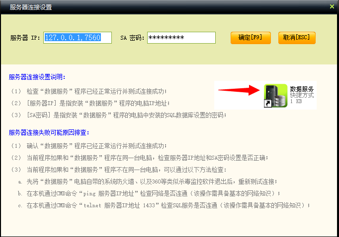 2、并将其中的服务器ip以及SA密码复制在服务器连接设置界面中,点击确认;