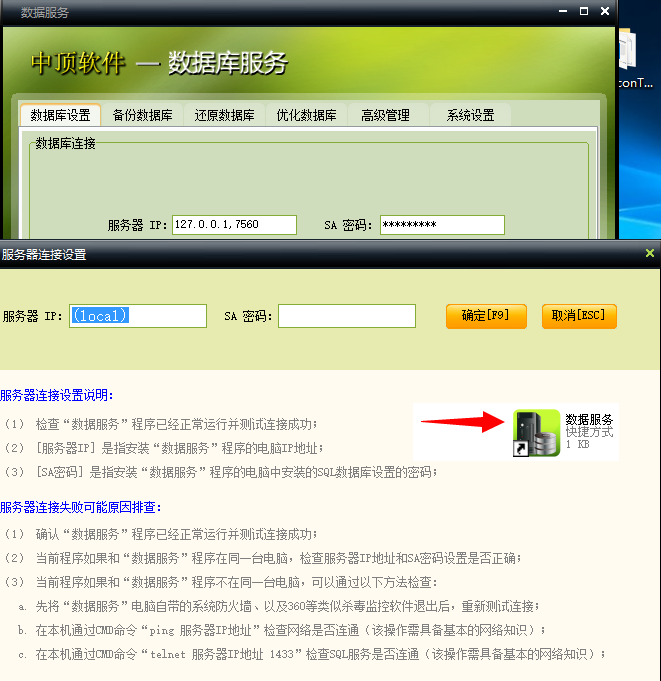 1、下载安装好中顶酒吧管理系统经典版,在桌面打开中顶酒吧数据服务出现以下界面,如下图;