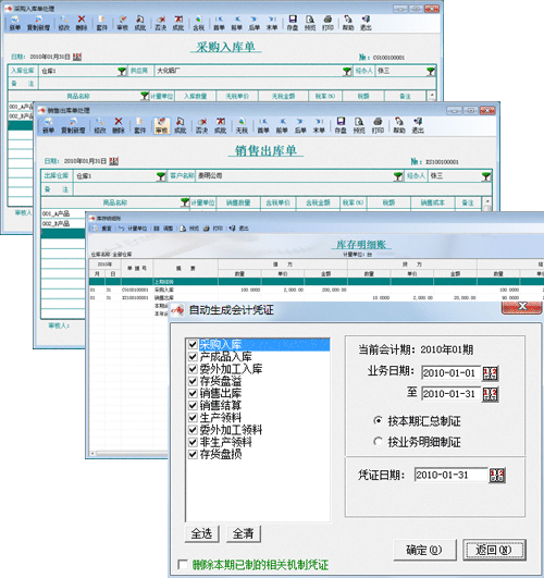 仓存管理作为财务管理软件的一个子系统,主要提供对企业的原材料、半成品和库存商品进行有效管理,包括商品采购、商品销售和存货的其它出库、入库管理。同时提供库存商品明细账和汇总表以及各类业务数据的查询分析。另外系统还可将各类业务数据自动生成会计凭证。