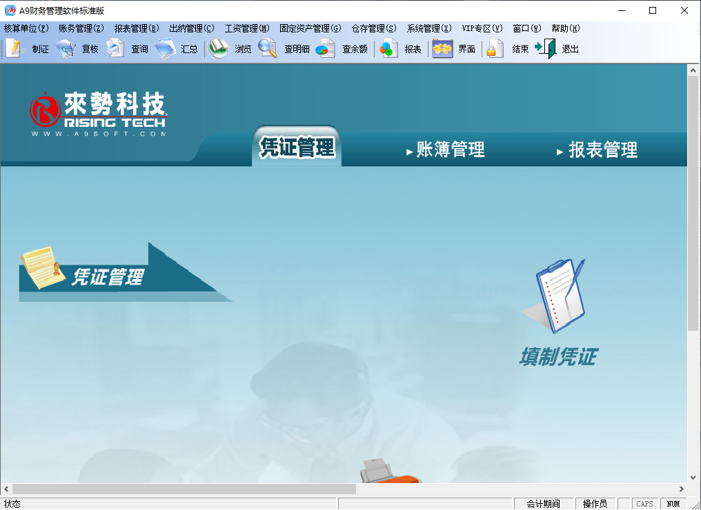 A9财务管理软件是一款非常专业的财务管理软件,现在无论是公司财务,还是个人财务管理都是非常的重要,稍有不慎就会造成严重的经济损失。所以小编在这里给大伙们推荐A9财务管理软件,A9财务管理软件商品化程度高,广泛适用于制造业、流通业、金融、电力、水利、房地产、服务业、政府机关、部队、及事业单位等各行各业。无论你从事哪方面A9财务管理软件都能帮你进行财务管理。A9财务管理软件还有强大功能模块供你选择凭证管理、账簿管理、报表管理、现金流量表管理、日记账管理、银行对账、往来账管理、部门核算管理、辅助核算项目管理、成本核算、自动转账、超级转账、外币核算、期末调汇、合并报表、汇总报表、财务分析、票据管理、工资核算、固定资产、会计制度管理等等应有尽有,A9财务管理软件可以满足你对财务管理的所以要求,而且还非常的安全,欢迎大家来下载使用!(小编亲测软件可以免费使用,可能有些功能会限制)