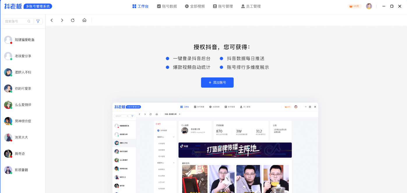 1、提升自媒体运营者的工作效率,可以同时管理多个账号。2、不限定抖音号的绑定,理论上只要您的账号足够多,您可以无限绑定。