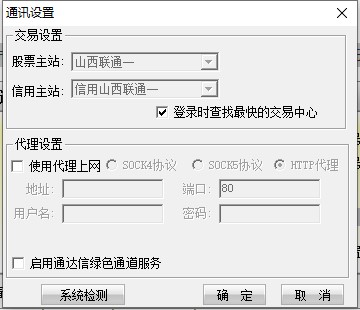 4、通讯设置包括了交易设置、股票主站、信用主站、代理设置、使用代理上网、系统检测等;