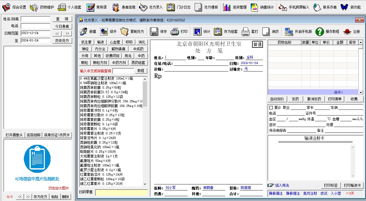 用电脑开处方是各大医院的趋势,门诊电子处方软件 V18.0 是为个体诊所、卫生室等基层医疗单位量身定做的门诊电子处方管理软件,可开西药、中药处方,全傻瓜化设计,界面操作一目了然,即使您是电脑新手,甚至不会打字,也可以很方便的使用它开出电子处方。特色
