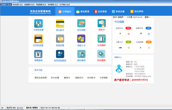 龙迅会员A6管理是一款会员管理软件,它适合单店使用的会员管理软件,如药店,超市,度假村,酒店等,只要是单个店面,不要求联网,数据同步的都可以使用,如果商家目前为单店铺,建议您使用会员管理系统A6,会员管理系统具有运行速度快会员制是一种成功的维护客户关系的经营模式。计算机信息处理技术的应用使会员制的管理更方便、更有效。龙迅会员A6管理软件是专门针对餐饮、美容美体、超市、会所、消费娱乐等场所开发的一套会员管理软件。