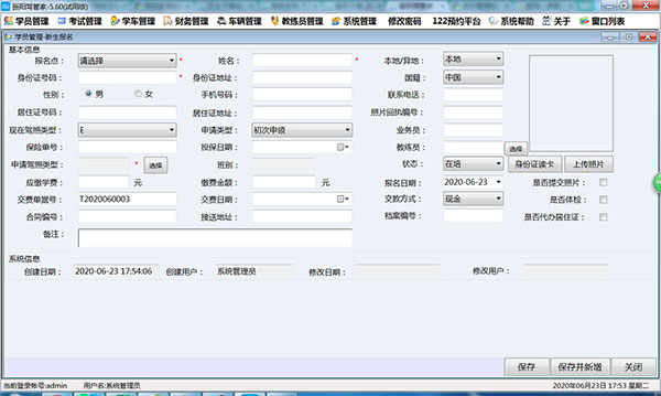 1、符合驾校业务流程的软件功能设计,使管理更精细。 2、支持多报名点业务应用。 3、学员驾培状态管理,对学员资料进行综合查询。 4、考试预约、各阶段考试成绩管理,方便导出EXCEL。 5、学员收费统计、欠费统计、学员欠费提示、学习证到期提醒。 6、财务单据对账、过账严格管控。 7、学员约车管理、教练员合格率统计,业务员业绩统计助力业绩提升。 8、灵活、强大的业务统计分析报表。 9、支持短信群发,方便与学员、教练员沟通。 10、支持身份证读卡器,学员资料采集更快捷、准确。