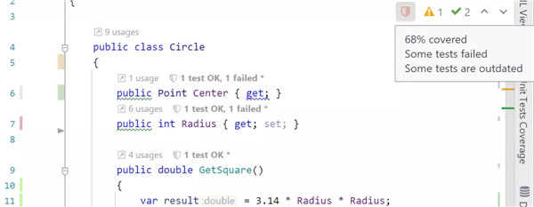 1、覆盖突出显示 dotCover可以为您提供方便的代码覆盖。您可以在Visual Studio中查看特定coverage会话中涵盖和未覆盖的突出显示的语句。 2、连续覆盖分析 dotCover提供了一个用于Continuous Integration服务器的控制台实用程序。此外,TeamCity内置了一个免费的服务器端版dotCover 。 3、过滤和排除节点 使用覆盖过滤器自定义覆盖率分析。从coverage快照中排除特定项目时,dotCover会立即重新计算coverage统计信息。 4、导航到覆盖测试 使用快捷方式检测哪些单元测试覆盖特定语句:弹出窗口Visual Studio将显示覆盖测试列表,并允许您导航到其中任何一个。功能介绍