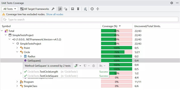 我们已将 Show Covering Tests(显示覆盖测试)操作添加到代码编辑器和 Unit Test Coverage(单元测试覆盖)窗口中的 dotCover 上下文菜单。 此操作会显示一个弹出窗口,其中所有覆盖测试都在同一位置。 弹出窗口还允许您创建新的覆盖会话。