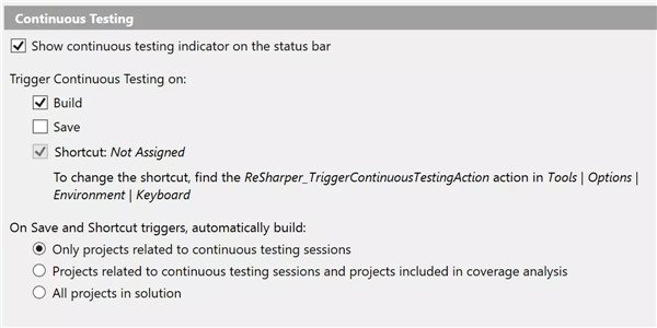 现在,可以使用快捷键直接触发持续测试。 此前,只能通过构建或保存项目来间接执行此操作。 这项功能在带有 ReSharper 的 Visual Studio 和 JetBrains Rider 中均可使用。