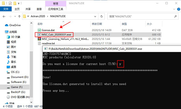 2、首先进入“MAGNiTUDE”文件夹下运行“MSC_Calc_20200331.exe”会自动生成许可证文件,输入y即可;