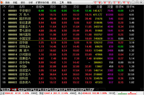 进入系统后,屏幕上首先出现行情显示窗口,列表显示最新股票交易行情。窗口顶部是主菜单条。注意,主菜单条的右端有两组按钮,分别控制系统窗口和其子窗口的最小化、层叠/还原、关闭。该系统支持整屏放大功能,整个界面就像在DOS下一样。