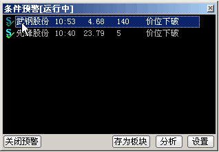 ▲ 在预警列表上双击“价位下破”或者“价位上破”的股票项,将弹出闪电卖出或者闪电买入的对话框,如下图: