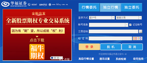 1、【进入系统】 ①在WindowsNT/2000/XP/vista 操作平台上,双击桌面上图标即可直接进入。 ②在开始菜单的程序中,沿着“开始”→“程序”→“华福证券通达信”→华福证券通达信,即可进入本系统。 ③选择“行情+交易”进入行情和交易综合版;选择“独立行情”进入单行情版;选择独立交易进入单交易版。 用户可选择行情委托、独立行情、独立交易三个选项。 行情委托:需填入资金账号、交易密码、验证码,填写完整后登录进入行情和交易界面; 独立行情:不需填写用户信息,点击后直接进入行情界面; 独立交易:需填入资金账号、交易密码、验证码,登陆后只进入交易界面,不显示行情;