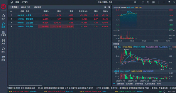 1、软件采用全新的UI交互,操作简洁流畅。 2、以现有流行设计模式、图形化表现形式突出各板块,更加符合热力眼动方式布局, 集中焦点直达目标板块。 3、提供全推送的全市场行情、海量的新闻资讯、强大的分析决策功能。 4、支持行情交易一体化操作,用户可以在PC行情界面快速下单。 5、所集成的交易版本支持最新的IPV6网络登录、沪深主板全面注册制改造、商密安全认证通道、一键打新规范优化等诸多新功能,持续跟进监管部门及交易所新业务要求。财达证券大智慧软件官方版使用教程