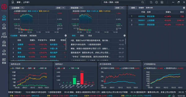 3、首页有大盘指数,领涨板块,资讯,自选,涨幅榜,涨停分析(当日涨停),底部4个图表(涨跌停走势,涨跌统计,昨日涨停表现,沪深港通资金),可以快速地了解自选个股行情及沪深全景行情;