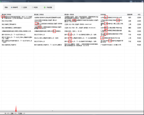 5、匹配完成后,可以在“匹配结果”中看到匹配的关键字在最后三条物流信息中出现的,如果不匹配的就会显示空白,而且在右下角状态栏还会显示统计结果,如图: