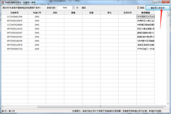 2、把快递单号、快递公司及收货地址复制到表格中,其他的列可以根据需要选填,然后点“确定导入软件中”,如图: