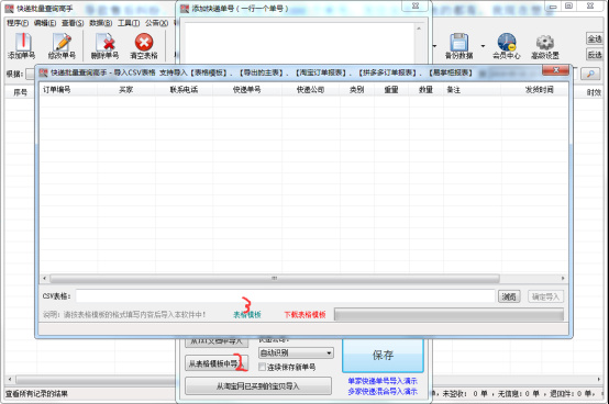 1、打开快递批量查询高手,点左上角的“添加单号”,再点“从表格模板中导入”--“表格模板”,如图: