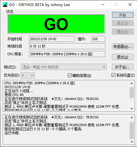1、orthos支持5种测试模式和10优先级别,测试模式分别是: ①少量FFT——考验CPU ②大量,适当FFT——考验部分内存 ③混合——考验CPU和内存 ④自定义 ⑤考验CPU——考验CPU及Gromacs核心