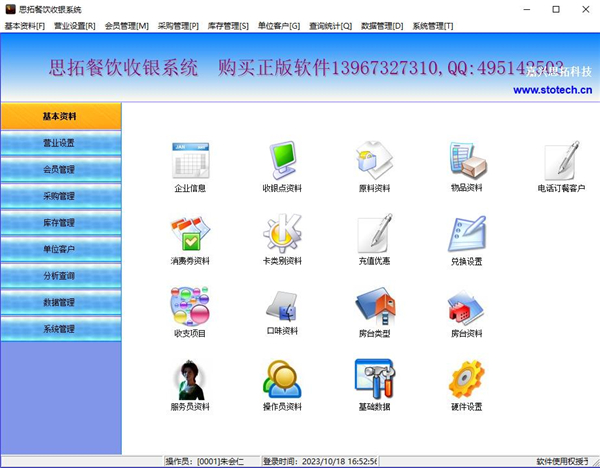 1、基本资料企业信息、收银点资料、原料资料、物品资料、电话订餐客户、消费卷资料、卡类别资料、充值优惠、兑换设置、收支项目、口味资料、房台类型、房台资料、服务员资料、操作员资料、基础数据、硬件设置