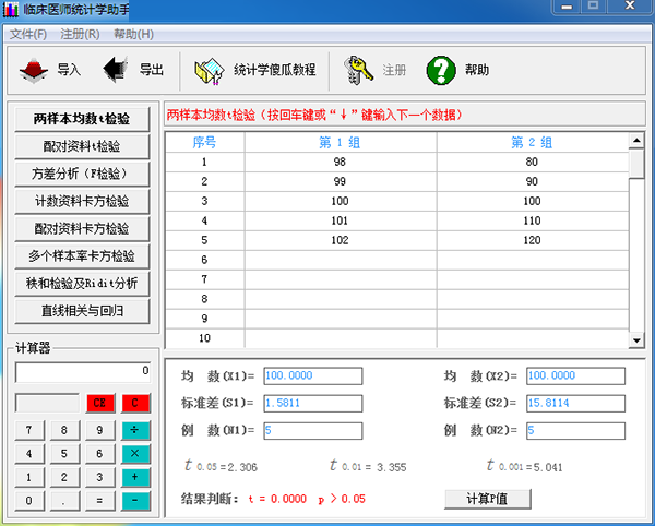 1、在输入原始数据的同时,立即显示t值及p值的计算结果, 需要对原始数据进一步处理时,则特别适用。