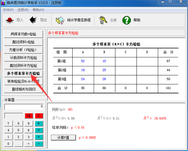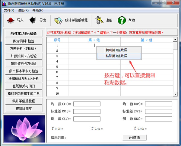 《临床医师统计学助手 V10.1》 是为临床医师量身定做的一款简明医学统计学处理软件,界面直观,全傻瓜化操作,即使仅初通统计学也极易上手。内置《医学统计学傻瓜教程》,能使您在数小时内即可学会进行常见的统计学数据处理。本软件能在每一个原始数据输入或修改的同时,实时显示t值、p值等计算结果,需要对原始数据进一步处理时,则特别适用。临床医师统计学助手使用教程