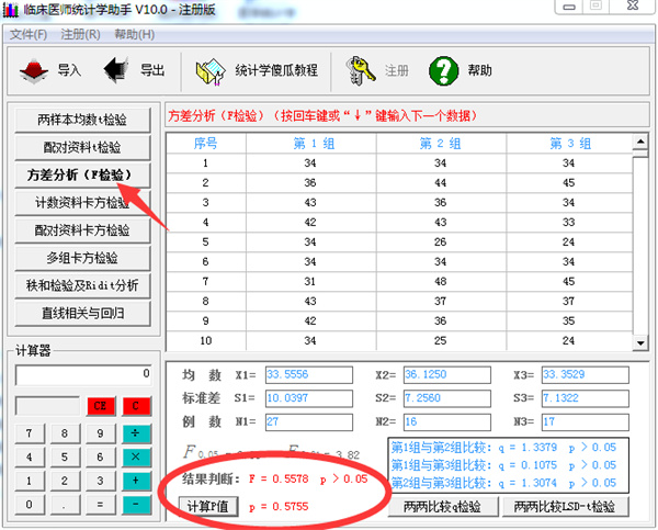 4、方差分析(F检验),并能自动进行两两比较,提供q检验及LSD-t检验两方法。