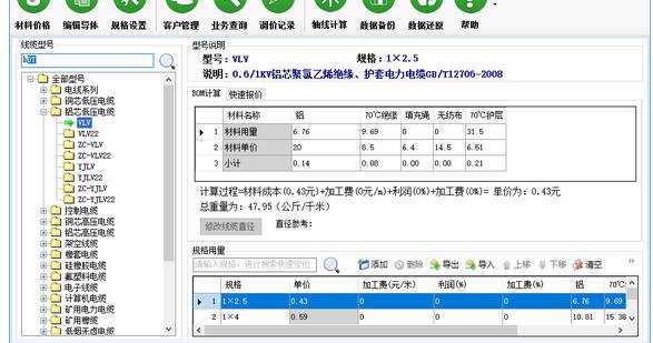 1、材料价格,根据市场情况灵活的管理电缆材料价格电缆价格由材料价格决定,市场上材料价格的变化直接影响了电缆价格的变化。材料价格管理,能快速灵活的修改电缆材料价格,计算出最准确的电缆市场报价。