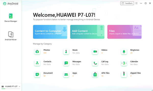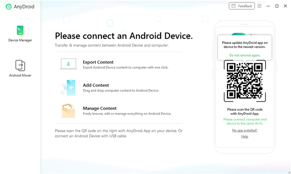 1、在电脑上安装并启动AnyDroid。通过USB电缆将您的Android设备连接到电脑。你可以在你的安卓手机上下载AnyDroid无需USB电缆,通过Wi-Fi将手机连接到电脑。