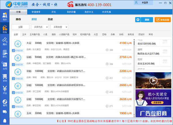 中时通电脑版是一款专门供求信息的发布、在线交易、行业资讯等更多功能的软件,它的全称叫做“中时通粮油供求服务平台”。中时通自主研发的“粮油互联网买卖平台”是中国大宗粮油行业独有的集供求信息发布、在线买卖结算、链接物流仓储为一体的综合性服务平台。平台上高频更新的海量粮油供求信息作为数据支撑,助力会员快速获取行情信息,把握买卖商机;“应约买卖”、“委托买卖”、“竞拍买卖”等各具优势的线上安全买卖模式,满足不同市场群体需求。中时通平台还开通有玉米、小麦、大豆、稻米、豆粕、食用油、花生粕、棉粕、菜粕、氨基酸、DDGS、添加剂、玉米副产品等近20个频道。目前,中时通已成功地为全国超12万家粮油贸易商提供了粮油买卖服务,并帮助众多的粮油企业将业务推广到全国各地。这款软件实行的是会员制,要注册会员才可以使用,目前平台上的会员注册已高达十几万!对此软件有兴趣的朋友们快来下载吧!