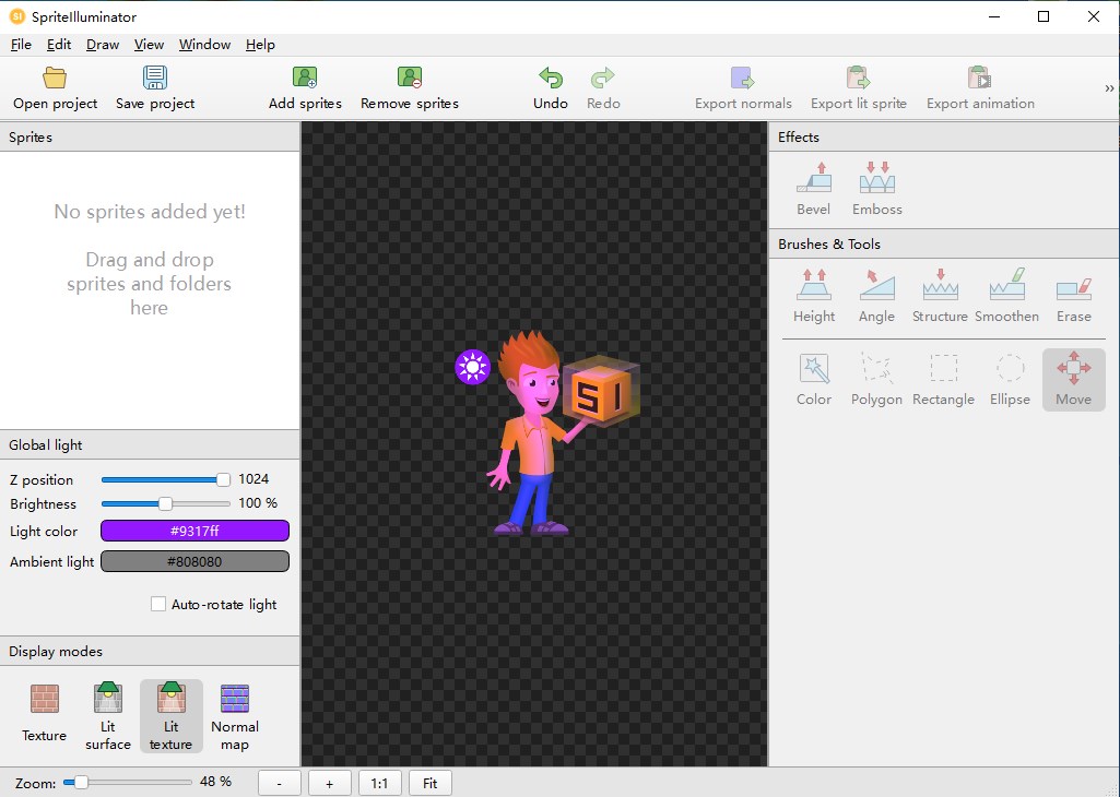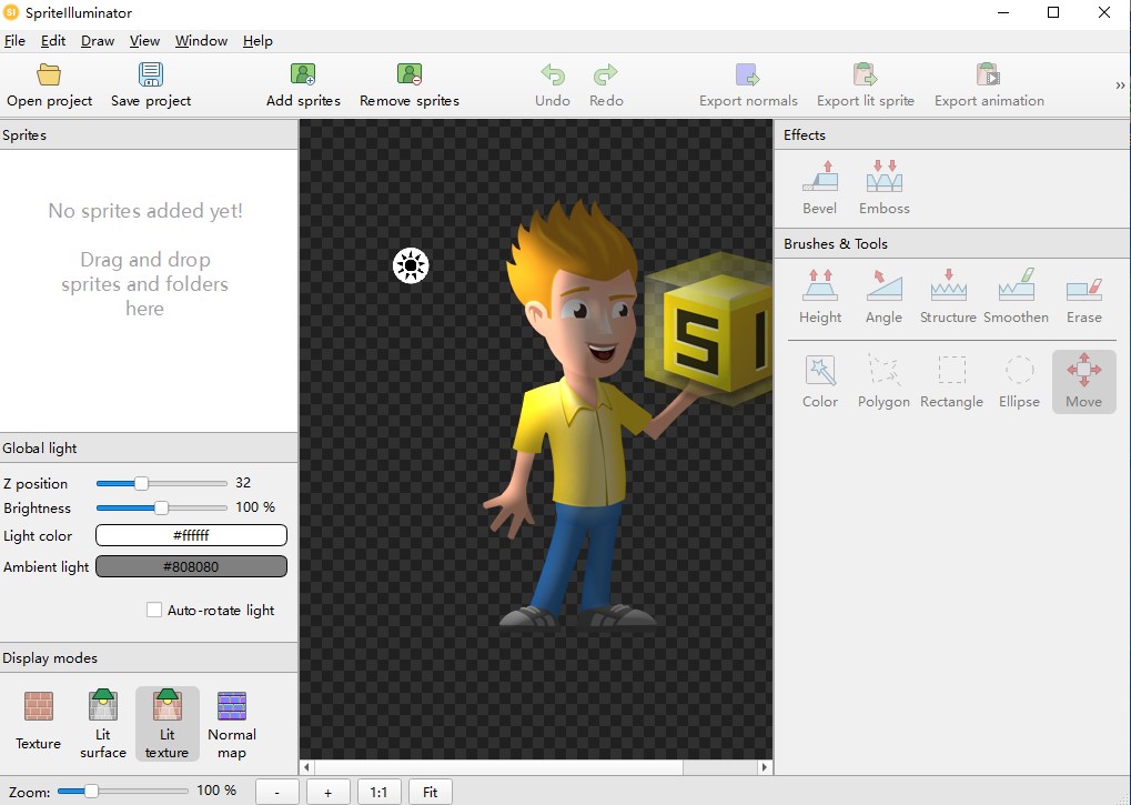 Spriteilluminator官方版是一款用于动态照明和特殊效果的法线贴图制作软件,由codeandweb官方推出,Spriteilluminator可以适用于Unity、Corona SDK和Phaser软件的辅助应用。Spriteilluminator最大的作用就是使得2D表面生成一定细节程度的光照方向和反射效果,使其相当于3d效果图,帮助用户节约精力和成本,提高用户满意度。用户能够使用Spriteilluminator根据精灵颜色的亮度添加高度差异,直接绘制法线贴图并微调效果,进入等距游戏的编辑模式。